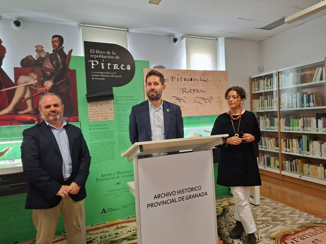 El delegado territorial de la Consejería de Cultura y Deporte, David Rodríguez, junto a la directora del Archivo Histórico, Eva Martín, y el director de la Real Chancillería, David Torres, inauguraron hoy la exposición 'El Libro de la repoblación de Pitres y su recuperación en el Archivo Histórico Provincial de Granada'.