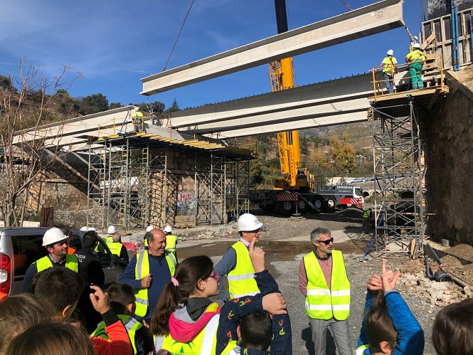 Precisamente un grupo de unos 70 alumnos de 5º y 6º de primaria del CEIP San José de Calasanz de Órgiva han sido testigos in situ de las delicadas maniobras que los técnicos han empleado para colocar las nuevas vigas. A una distancia prudente para los escolares, los responsables de la obra también les han dado las explicaciones más básicas y les han resuelto todas las dudas que les han surgido. Posteriormente en el pabellón municipal se les ha preparado un desayuno.