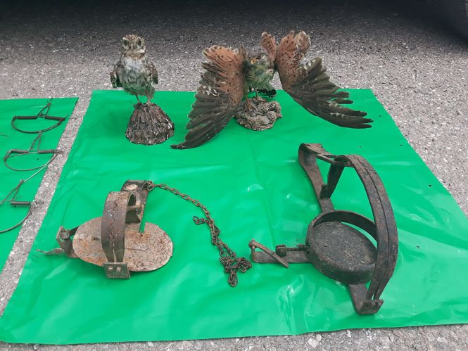 Además se han decomisado dos animales disecados pertenecientes a las especies autóctonas mochuelo y cernícalo vulgar. Según la ley 8/2003, de 28 de octubre, de flora y fauna silvestres, en su artículo 7.2.d. se establece la prohibición de "la posesión, retención, naturalización, venta, transporte para la venta, retención para la venta y, en general, el tráfico, comercio e intercambio de ejemplares vivos o muertos de especies silvestres o de sus propágulos o restos, incluyendo la importación, la exportación, la puesta en venta, la oferta con fines de venta o intercambio, así como la exhibición pública." Esta misma normativa es la que prohíbe asimismo la tenencia y comercialización de "todo tipo de instrumentos o artes de captura o muerte de animales masiva o no selectiva", como son los intervenidos en esta actuación por los Agentes de Medio Ambiente.