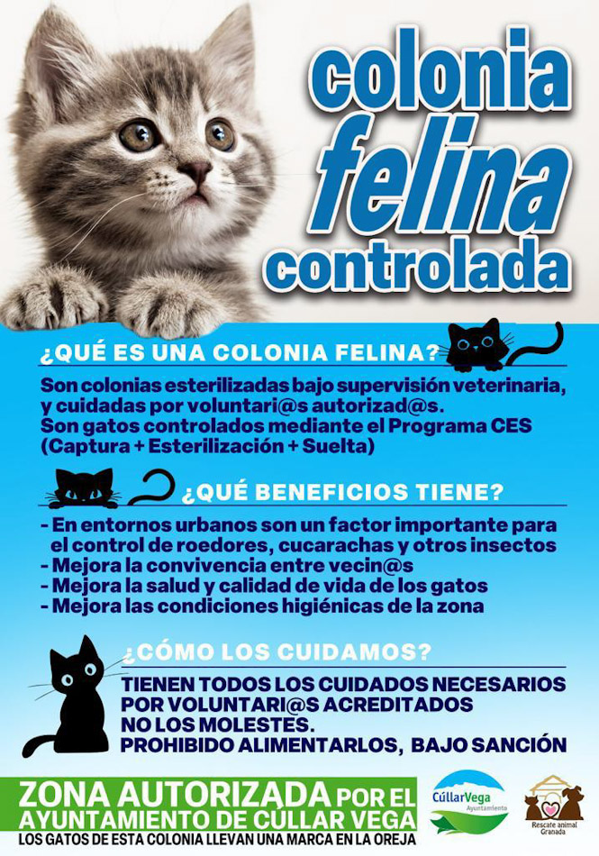 "También hemos puesto en marcha por primera vez en el municipio un protocolo CES (Captura, Esterilización y Suelta), que estamos aplicando a todas las colonias de gatos que existen en el municipio con la ayuda de esta red de voluntarios", explica el alcalde de Cúllar Vega, Jorge Sánchez. En virtud del mismo, los voluntarios culleros capturan de forma selectiva a los gatos, tanto machos como hembras, para proceder a su esterilización.