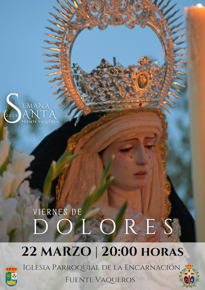 Tras culminar el I Pregón de la Semana Santa de Fuente Vaqueros el pasado 9 de marzo con la voz del vestidor de la Dolorosa fuenterina, Álex Sánchez y la imposición de medallas a los nuevos hermanos, la Asociación Parroquial del Santísimo Cristo de la Victoria y Nuestra Señora de los Dolores de Fuente Vaqueros dio a conocer también el cartel anunciador de la salida procesional de Nuestra Señora de los Dolores. Será el próximo 22 de marzo a las 20:00 horas desde la Iglesia Parroquial de la Encarnación de la localidad metropolitana, tras los actos litúrgicos.
