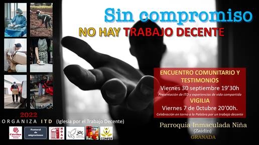 En torno al 7 de octubre, Jornada Mundial por el Trabajo Decente, Cáritas junto a otras organizaciones de inspiración católica y congregaciones religiosas, impulsan la iniciativa Iglesia por el Trabajo Decente (ITD) y promueven actos reivindicativos y celebrativos en todas las plazas y parroquias de las diócesis. El pasado viernes tuvo lugar un encuentro comunitario en Granada y el próximo viernes día 7 de octubre tendrá lugar en la Parroquia Inmaculada Niña del Zaidín una vigilia de oración a las 20:00 de la tarde, abierta a todo aquel que desee participar.