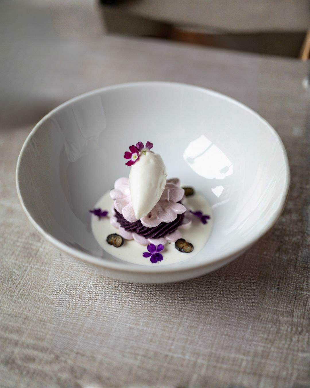 El final dulce mantiene el vínculo con el territorio. Flores de Sierra Nevada, un merengue de violetas con helado de lavanda y ganache de arándanos, ofrece un cierre aromático y delicado; mientras que Jardines del Generalife, un turrón de chocolate Jivara con pistacho tostado infusionado en té pakistaní y sorbete de fruta de la pasión, aporta un contraste fresco y evocador.