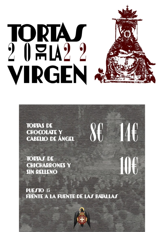 Tras dos años de pandemia, la Hermandad del Santo Vía Crucis vuelve al entorno de la fuente de las Batallas para la venta de Tortas de la Virgen del 23 al 25 de septiembre. Los hermanos y las personas en general que deseen adquirir este producto podrán hacerlo durante el próximo fin de semana, desde el viernes a las doce del mediodía hasta el domingo hasta agotar existencias.