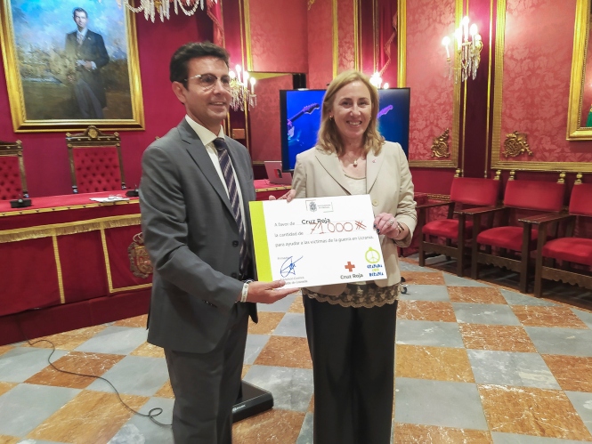El alcalde de Granada, Francisco Cuenca, ha hecho entrega esta mañana de un cheque por valor de 71.000 euros a la presidenta de Cruz Roja Granada, María Eugenia Rodríguez-Bailón, con motivo de todo lo recaudado en el concierto solidario 'Granada con Ucrania' organizado por el Ayuntamiento de Granada y cuya celebración el pasado jueves 28 de abril en el Palacio Municipal de Deportes con la "histórica participación" de artistas y bandas de primer nivel de la escena local fue "un rotundo éxito".