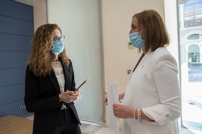 La delegada territorial de Igualdad, Políticas Sociales y Conciliación, Ana Berrocal, junto a Eugenia Rodríguez-Bailón han presentado el programa Tarjeta monedero que ha puesto en marcha la Consejería para cubrir las necesidades básicas de las personas más vulnerables en la crisis del Covid-19. En la provincia de Granada esta iniciativa atenderá a 3.525 familias, lo que supone una inversión de 2,3 millones de euros.