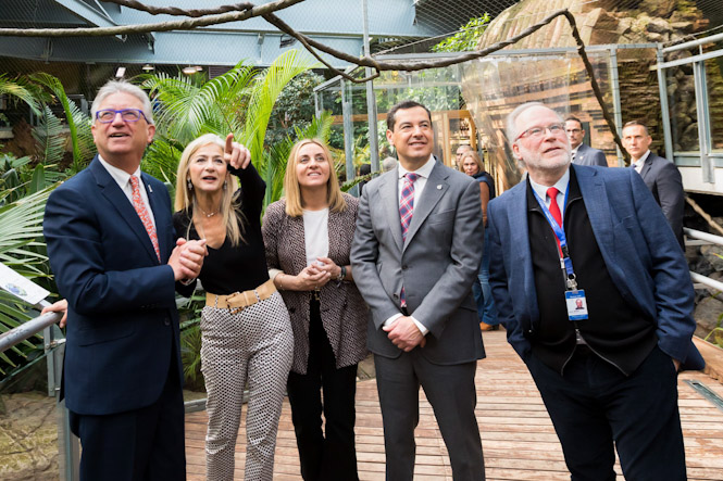 El Presidente de la Junta de Andalucía ha comentado en su intervención que “ es hora de sacudirse tópicos. No hay carreras de chicos y chicas. Lo que si hay es una gran necesidad de profesionales, en áreas como la física, la inteligencia artificial las ingenierías e incluso en el sector del videojuego. Aún hay cortes generacionales en los que sigue prevaleciendo el número de chicos y eso es hora de que vaya cambiando” Además ha visitado algunos de los espacios expositivos del Parque de las Ciencias, como la nueva exposición temporal “Inteligencia Artificial. Una exposición sobre las personas, los datos y el control”, la exposición Wow, el BioDomo y el Pabellón Viaje al cuerpo humano, incluido su laboratorio de plastinación, donde ha podido conocer esta reciente técnica para la conservación de cuerpos y órganos. Juanma Moreno ha comentado encontrarse “realmente fascinado y sorprendido por las exposiciones, el BioDomo y el Parque de las Ciencias en general, un lugar al que sin dudas volverá y recomendará”.
