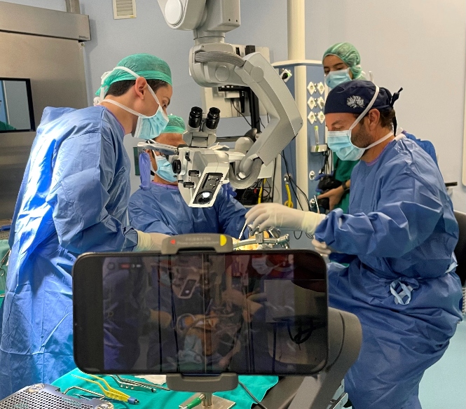 Durante la cirugía, los alumnos, ubicados físicamente en el paraninfo de la Universidad de Granada, han podido ver diversas estructuras anatómicas profundas del cerebro a las que se accede tras una cuidadosa disección de los lóbulos cerebrales. “Ello es posible gracias al microscopio operatorio, instrumento esencial en la práctica neuroquirúrgica y del cual el Hospital Vithas Granada cuenta con uno de los de más reciente generación. Se han mostrado estructuras como el nervio óptico o el trigémino a través de corredores anatómicos que habitualmente utiliza el neurocirujano en su práctica diaria”, explica el doctor Horcajadas.