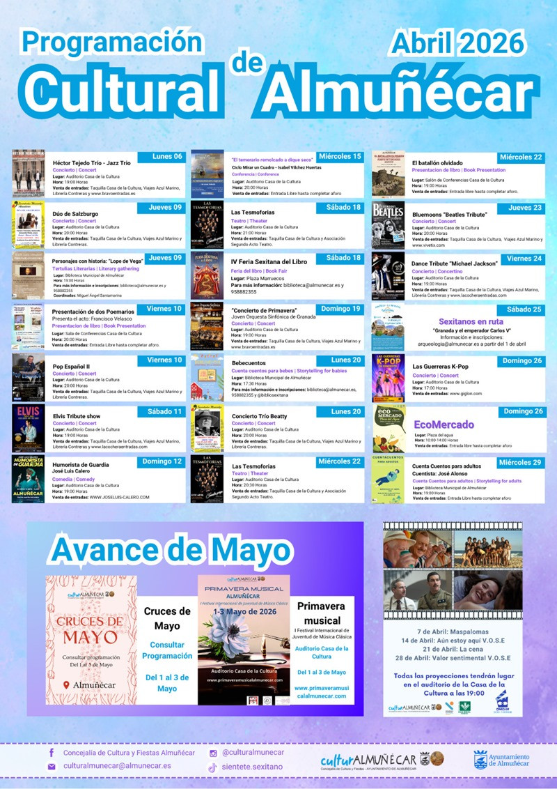 El concejal de Cultura del Ayuntamiento de Almuñécar, Alberto Manuel García Gilabert, ha dado a conocer la programación cultural prevista para el mes de abril, una agenda amplia y diversa que incluye propuestas de música, teatro, literatura, cine y actividades familiares.