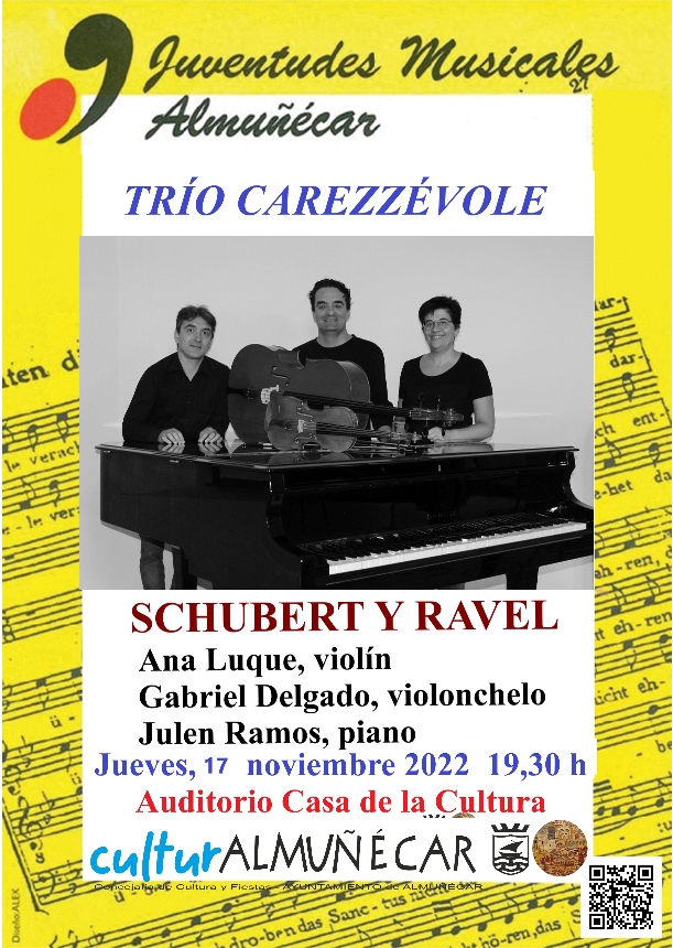 Juventudes Musicales de Almuñécar programa un nuevo concierto de temporada esta tarde-noche a cargo del Trío Carezzévole formado por: Ana Luque (violín), Gabriel Delgado (violonchelo) y Julen Ramos (piano). El programa recoge obras de Schubert y Ravel.