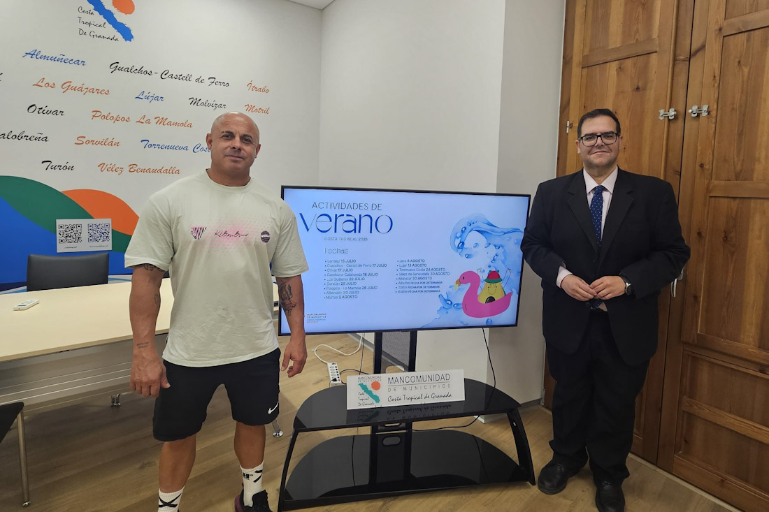 El presidente de la Mancomunidad de Municipios de la Costa Tropical, Rafael Caballero, junto al concejal de Deportes del Ayuntamiento de Motril, Daniel Ortega, han presentado el programa de actividades de verano que se desarrollará en 18 municipios de la Costa Tropical, incluyendo la ELA Carchuna-Calahonda.