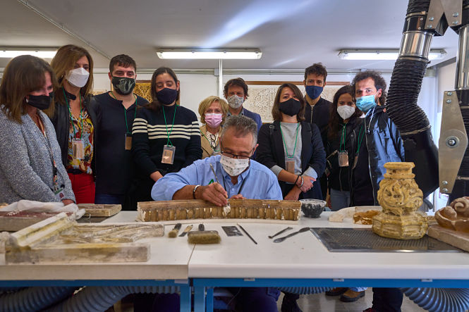 La presentación de este acuerdo ha tenido lugar en el marco de la visita que los finalistas del VI Premio Cervezas Alhambra de Arte Emergente a los talleres de madera y yesería de la Alhambra, piezas clave de su decoración más icónica, donde han tenido la oportunidad de dar un paseo más en su viaje de inspiración acercándose al trabajo artesanal que se llevaba a cabo en el corazón del monumento nazarí. Los artistas han podido ser testigos del minucioso trabajo que realizan hoy día las manos expertas del personal encargado de la restauración de estos materiales. Ese proceso intrínsecamente artesanal, en el que es necesario olvidarse de la prisa para prestar atención a cada detalle a fin de garantizar el respeto a la esencia original, representa sin duda el hilo conductor de las obras que optan a este Premio.
