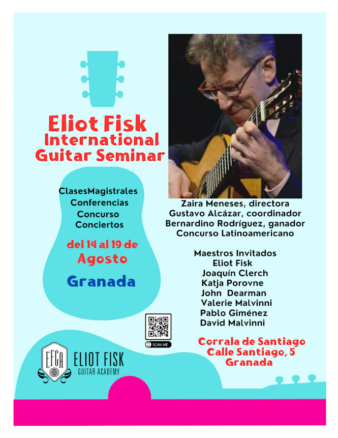 La ciudad de Granada se prepara para recibir el 1º Seminario Internacional de Guitarra "Eliot Fisk", que se llevará a cabo del 14 al 19 de agosto de 2023 en la Corrala de Santiago de Granada (C/ Santiago, 5). Alumnos internacionales de alto nivel participarán en las clases magistrales impartidas por los maestros Eliot Fisk y Joaquín Clerch. Asimismo, los estudiantes participarán en el Concurso Internacional impartido por el seminario. El ganador/a del concurso tendrá como premio un viaje a la ciudad de Boston (Massachusetts), Estados Unidos, para tocar un concierto de guitarra como solista con la «Orquesta latinoamericana» fundada por la Academia Eliot Fisk. El seminario está organizado por la guitarrista mexicana de trayectoria internacional Zaira Meneses junto con el maestro Gustavo Alcázar, quien obtuvo el título de Master of Arts en la especialidad de guitarra bajo la tutela del maestro Fisk en la Universidad Mozarteum de Salzburgo, Austria.