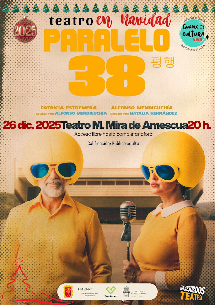 La concejalía de Cultura del Ayuntamiento de Guadix, representada por Encarni Pérez, con el apoyo de la Diputación Provincial de Granada, incorpora a su programación navideña el espectáculo de teatro adulto Paralelo 38, de la compañía Los Absurdos Teatro. La obra regresa al Teatro Municipal Mira de Amescua tras el éxito obtenido entre el público con sus montajes anteriores, motivo por el cual la concejalía apuesta de nuevo por esta formación para presentar su último estreno. La función tendrá lugar el 26 de diciembre de 2025 a las 20:00 horas, con acceso libre hasta completar aforo, garantizando así que toda la ciudadanía tenga la oportunidad de acceder a la cultura en estas fechas.