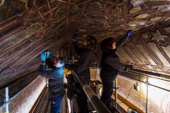 El Patronato de la Alhambra y Generalife ha iniciado los trabajos de restauración que permitirán fijar la policromía de la armadura del Cuarto Dorado, "una intervención previa que busca corregir durante la restauración de las cubiertas del Mexuar las deficiencias estructurales que presenta".