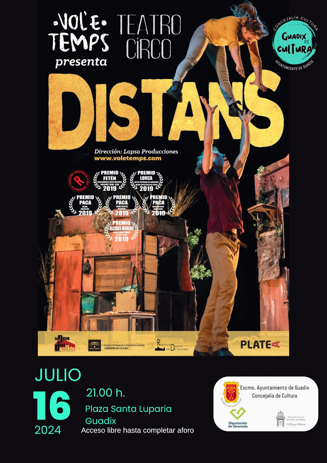 La concejalía de Cultura del Ayuntamiento de Guadix, representada por Encarni Pérez, ofrece el próximo martes 16 de julio el magnífico espectáculo de teatro circo “DistanS” que pondrá en escena la compañía Vol´e Temps en plaza Santa Luparia a las 21:00 horas, con acceso libre hasta completar aforo. Se trata del espectáculo que estaba previsto se llevara a cabo en Navidad pero que tuvo que ser suspendido por el robo de la escenografía a la compañía.