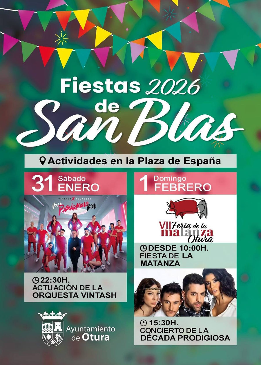 El municipio de Otura acogerá el próximo fin de semana, los días 31 de enero y 1 de febrero (sábado y domingo), actividades con motivo de las fiestas de San Blas, el patrón de la localidad, con conciertos en una carpa climatizada y entrada libre y gratuita. La concejalía de Fiestas ha presentado la programación de estas fiestas, que tendrán como plato fuerte el concierto de la orquesta Vintash (el sábado 31 de enero) y el mítico grupo La Década Prodigiosa (el domingo, día 1). Las actuaciones tendrán lugar a las 22:30 horas y a las 15:30 horas, respectivamente.