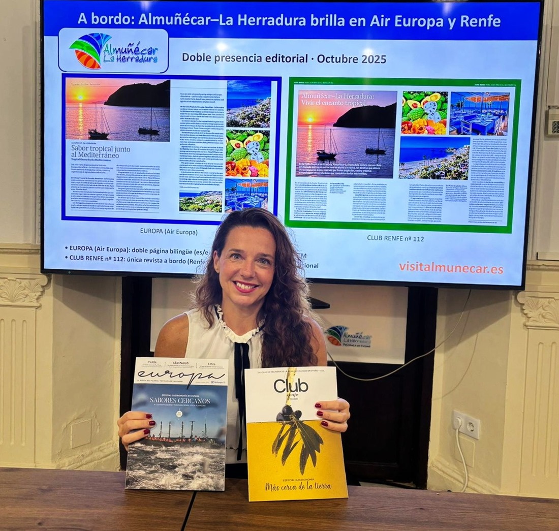 El destino turístico de Almuñécar y La Herradura aparece en dos publicaciones de amplia difusión a bordo y en canales digitales: el número de octubre de Europa (Air Europa), con una doble página bilingüe titulada "Almuñécar – La Herradura: Sabor tropical junto al Mediterráneo", y el nº 112 de Club Renfe, que incluye el artículo "Almuñécar – La Herradura: Vivir el encanto tropical".