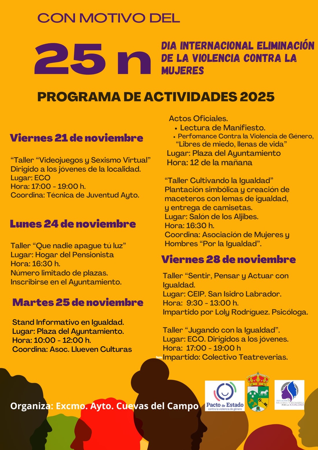 El Ayuntamiento de Cuevas del Campo ha organizado un programa de actividades con motivo del Día Internacional de la Eliminación de la Violencia contra la Mujer que se conmemora el 25 de noviembre, una “fecha de compromiso y de unidad frente a la violencia machista que sufren las mujeres y las niñas”, como ha señalado la alcaldesa, Carmen Rocío Martínez.