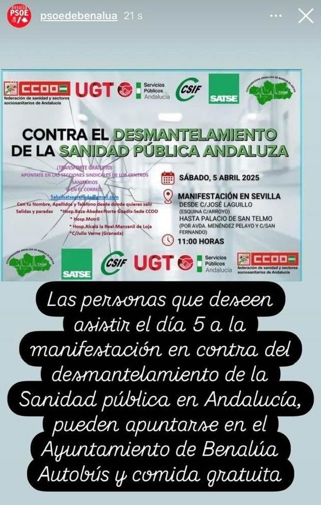 El PP de Benalúa ha denunciado la publicación en las redes sociales de un anuncio en el que se informa de la posibilidad de acudir en autobús y con comida gratis a una manifestación convocada por los sindicatos contra la política sanitaria de la Junta de Andalucía. Según el comunicado, los interesados en asistir debían apuntarse en el Ayuntamiento.