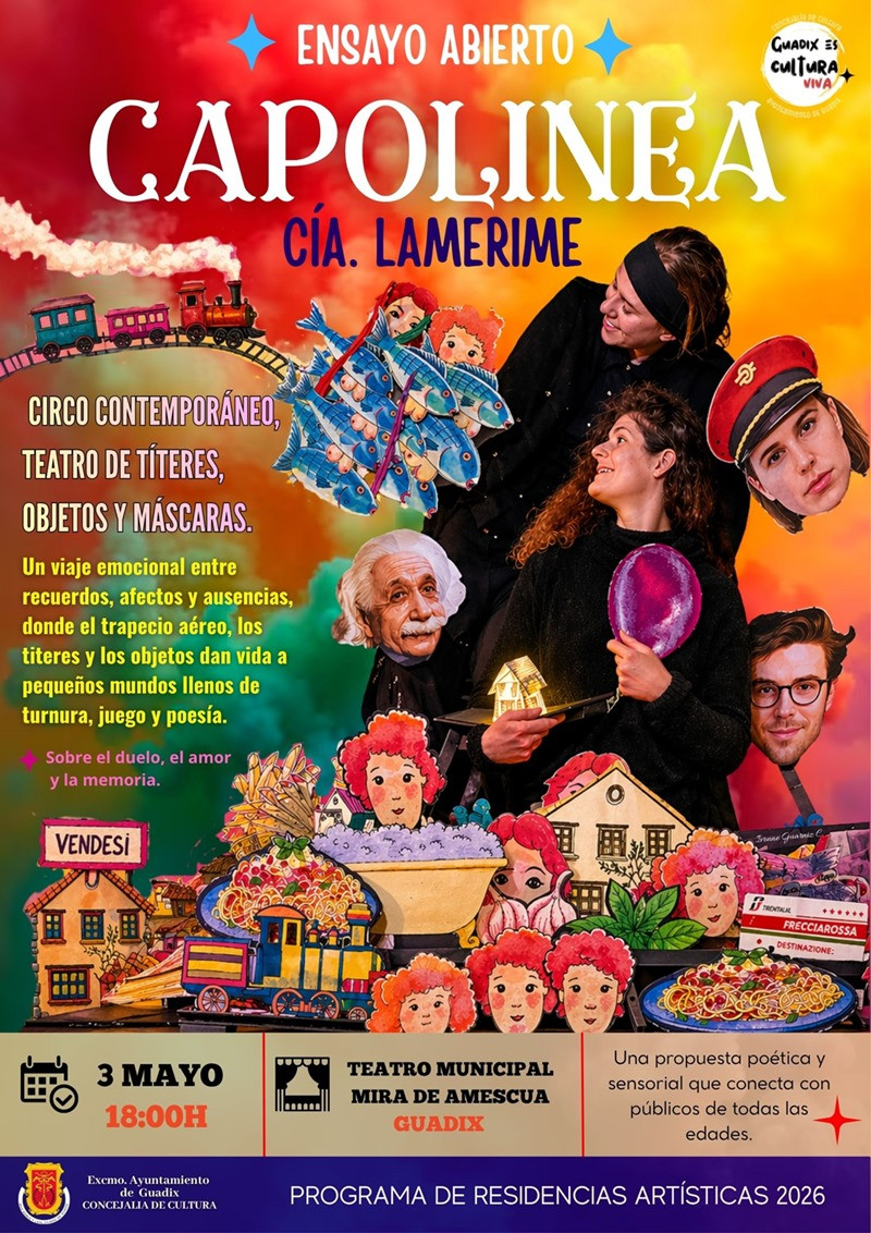 La concejalía de Cultura del Ayuntamiento de Guadix, representada por Encarni Pérez, continúa desarrollando su Programa de Residencias Artísticas con la celebración de un nuevo ensayo abierto del espectáculo “CAPOLINEA”. La cita tendrá lugar el próximo domingo 3 de mayo a las 18:00 horas en el Teatro Municipal Mira de Amescua, con entrada libre hasta completar aforo.