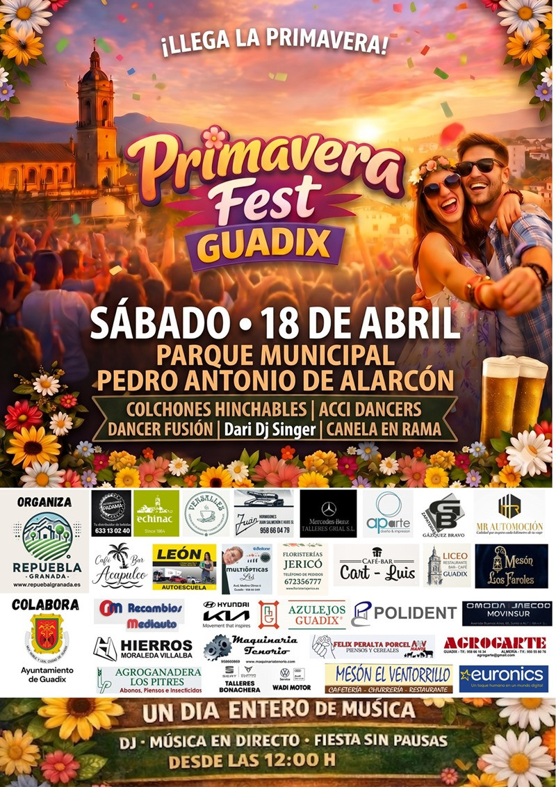 El próximo sábado 18 de abril, el Parque Municipal de Guadix acogerá una jornada festiva que se prolongará desde las 12:00 hasta las 02:00 horas bajo el nombre de “Primavera Fest Guadix”. Se trata de una propuesta abierta a toda la ciudadanía que combina ocio, música y actividades al aire libre con el objetivo de fomentar la convivencia y el disfrute de los espacios públicos.