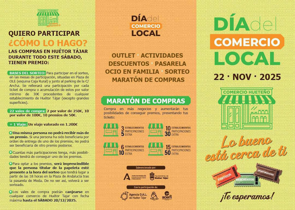El Ayuntamiento de Huétor Tájar y la Agencia OAL organizan este sábado, 22 de noviembre, la 5ª edición del Día del Comercio para apoyar al comercio local, con un premio total de 3.500 euros en sorteos para quienes realicen compras en los comercios de proximidad. La actividad comenzará a las 10 de la mañana con la apertura de comercios y la instalación de mesas para participar en el sorteo en la Plaza de España y calle Ancha.