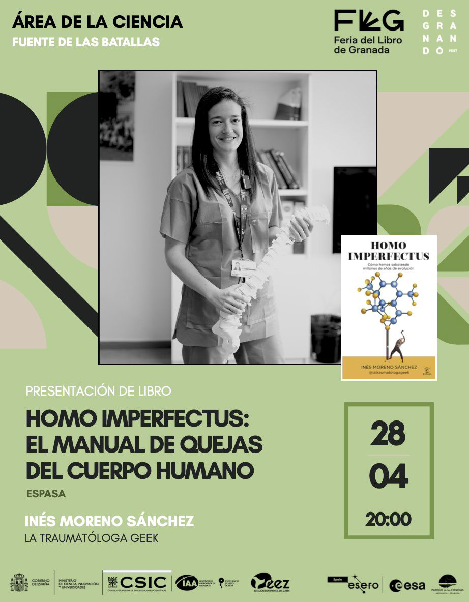 El 28 de abril a las 20:00, la autora participará en el Área de la Ciencia, en la Fuente de las Batallas de Granada. Bajo el título Homo Imperfectus, el manual de quejas del cuerpo humano, la sesión propone una aproximación divulgativa a las señales del organismo y su interpretación.