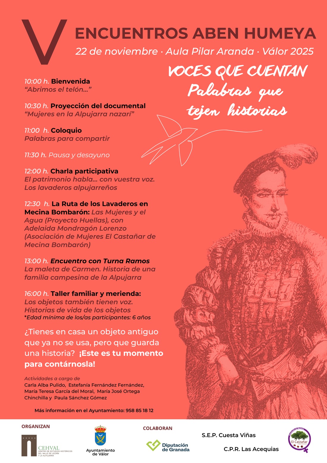El próximo sábado 22 de noviembre de 2025, la localidad alpujarreña de Válor volverá a ser punto de encuentro para la emoción, la palabra y la memoria compartida con la celebración de los V Encuentros Aben Humeya, bajo el lema “Voces que cuentan: palabras que tejen historias”. Organizados por el Centro de Estudios Históricos del Valle de Lecrín y la Alpujarra (CEHVAL) y el Ayuntamiento de Válor, estos encuentros, que alcanzan su quinta edición, invitan a toda la comunidad —niños, jóvenes, mayores y familias— a participar activamente en una jornada que celebra el valor del patrimonio cultural, la historia viva y las emociones que nos unen.