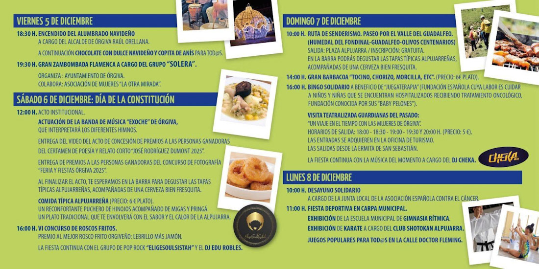 El sábado 6, Día de la Constitución, los actos institucionales darán comienzo a las 12:00 horas con la actuación de la Banda de Música “Exoche” de Órgiva. Se presentará el vídeo oficial de concesión de premios del Certamen de Poesía y Relato Corto “José Rodríguez Dumont 2025” y se entregarán los premios del concurso de fotografía “Feria y Fiestas Órgiva 2025”. Por la tarde, se celebrará el VI Concurso de Roscos Fritos, cuyo ganador recibirá un lebrillo y un jamón. La jornada finalizará con la actuación del grupo de pop rock “EligesoulSistah” y el DJ Edu Robles.