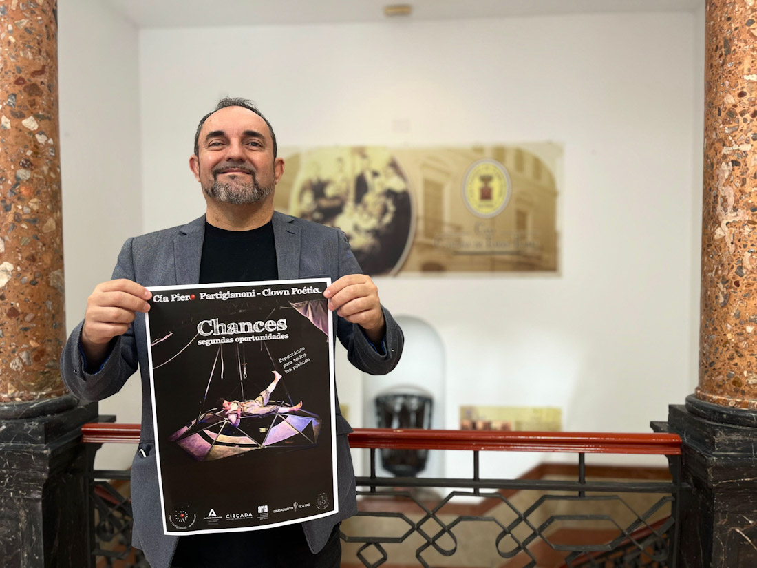 El concejal de Cultura del Ayuntamiento de Motril, Miguel Ángel Muñoz Pino, presentó esta mañana la obra “Chances. Segundas Oportunidades”, un espectáculo de clown poético a celebrarse el viernes 28 de noviembre en el Teatro Calderón de la Barca. El montaje, a cargo de la Compañía Piero Partigianoni, fusiona humor gestual y lenguaje visual lleno de lirismo para narrar la historia de Pícaro, un soñador que busca volar y alcanzar sus sueños.