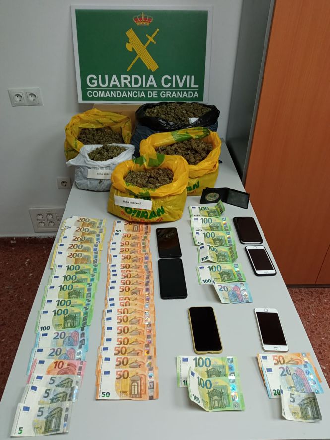 En esta operación la Guardia Civil se ha incautado de más de tres kilos y medio de marihuana, de tres mil trescientos diez euros procedentes de la venta de la droga y de seis teléfonos móviles.