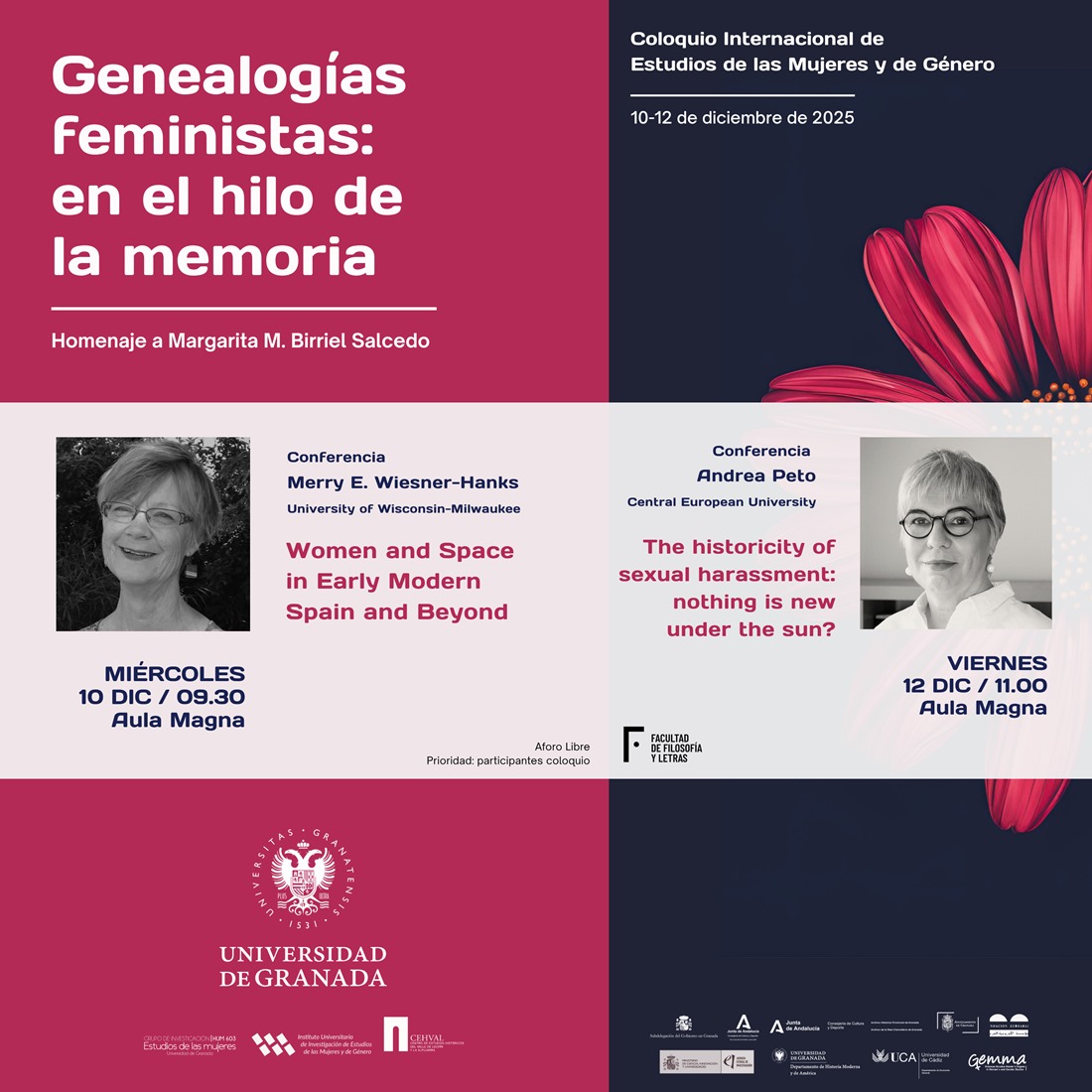 Destacan las conferencias plenarias de Merry E. Wiesner-Hanks y Andrea Pető, figuras claves del feminismo académico contemporáneo. Wiesner-Hanks inaugurará el ciclo con la conferencia Women and Space in Early Modern Spain and Beyond, y Pető abordará la historicity of sexual harassment el viernes 12.
