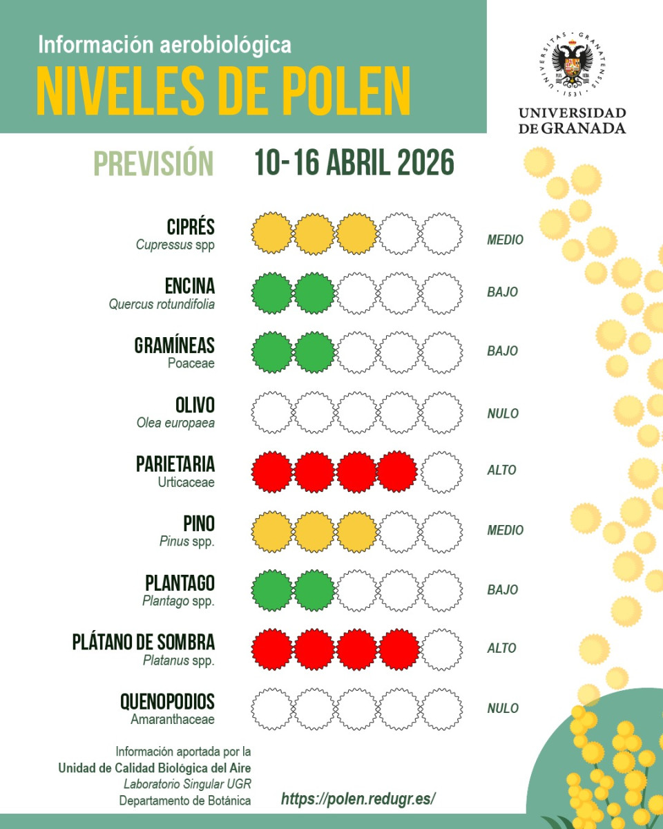 La Universidad de Granada, a través de la Unidad de Calidad Biológica del Aire (UCBA-UGR), informa de que las concentraciones de polen en la ciudad de Granada continúan en niveles elevados, con especial incidencia de los plátanos de sombra y las parietarias, según el seguimiento aerobiológico semanal.